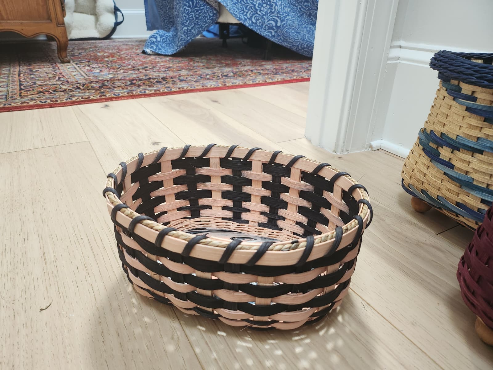 This hand-woven basket is decorated with a beautiful acrylic and epoxy base that measures approximately 6" tall by 10" wide. With its unique craftsmanship, it's the perfect addition to any home or office.